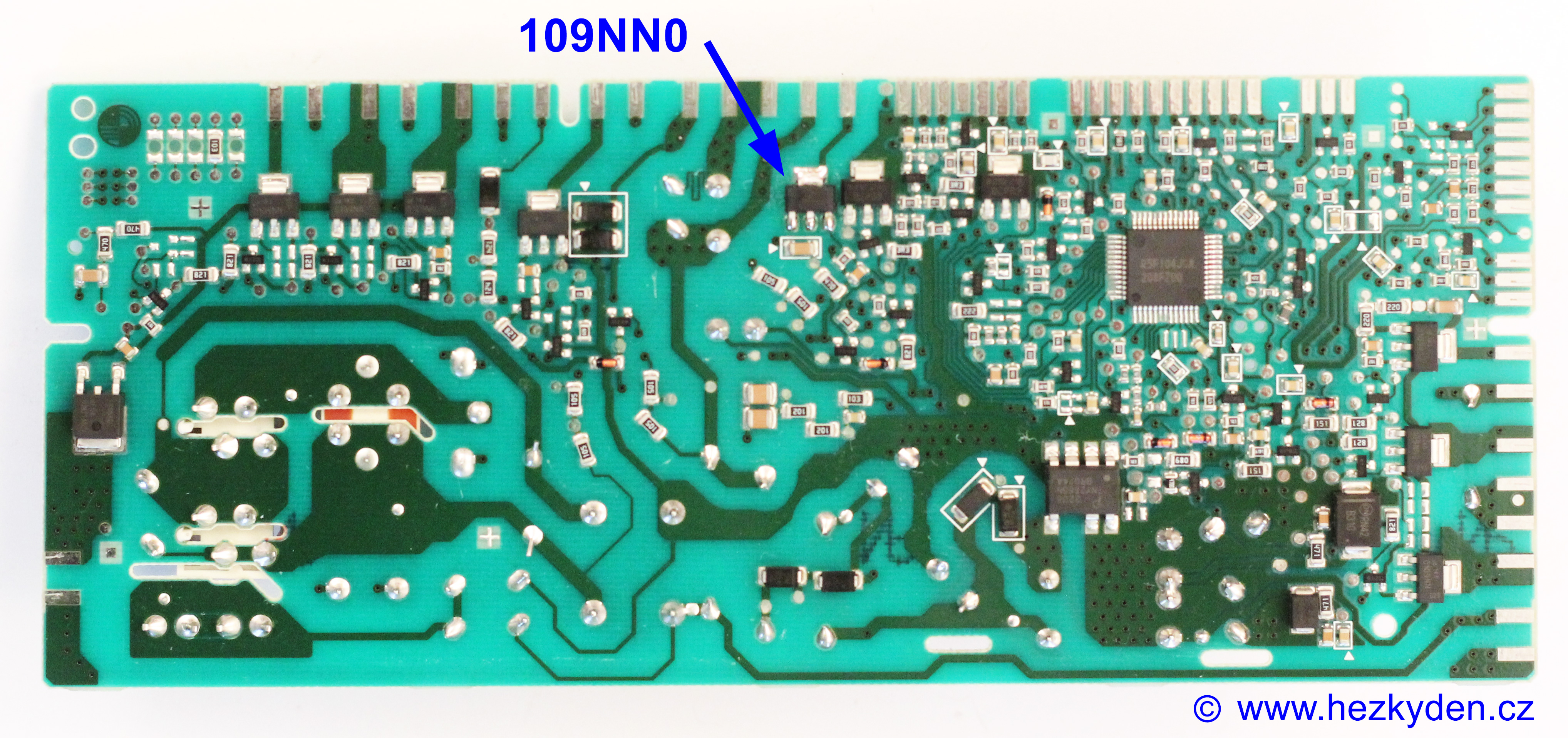 Vypálený triak je zde vyznačen tučně a na obrázku na něj ukazuje modrá šipka.